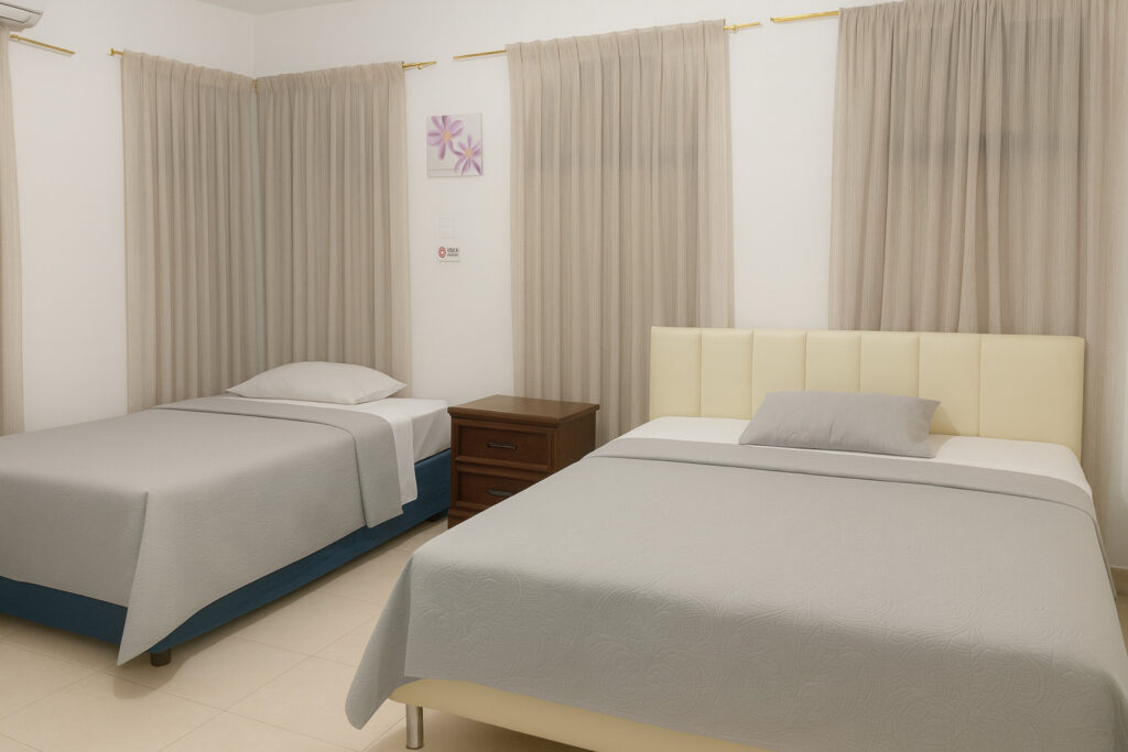 Diseñada para familias o grupos que buscan comodidad y amplitud. La habitación cuádruple ofrece un espacio generoso con camas confortables, baño privado, aire acondicionado y una atmósfera cálida ideal para compartir momentos de descanso y alegría.